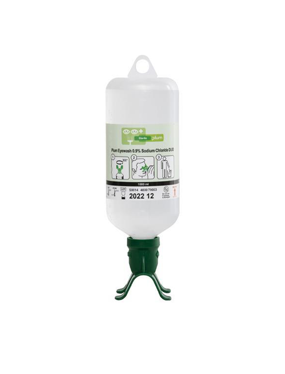 1,0 l Ögonsköljning Duo 0,9% steril natriumklorid for att skölja ögonen efter olyckan där damm och smuts varit inblandat. Utrustad med ergonomisk DUO ögonkopp som gör det möjligt att spola båda ögonen samtidigt. Flaskan kan användas för påfyllning i stationer eller löst.